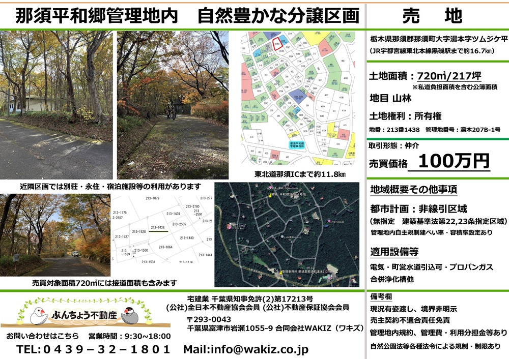 | 所在地 | 栃木県那須郡那須町大字湯本字ツムジケ平213番1438※那須平和郷管理地番号:湯本207B-1号地 |